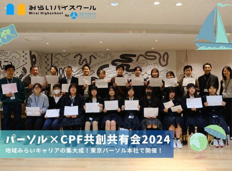 2025年1月、「地域みらいキャリア」プログラムは、協力企業であるパーソルホールディングスと「パーソル×CPF共創共有会2024」を実施しました。プログラムの実施報告や高校生による発表「自分のみらいキャリア … 続きを読む みらキャリの集大成、「パーソル×CPF共創共有会2024」を東京にて開催!
